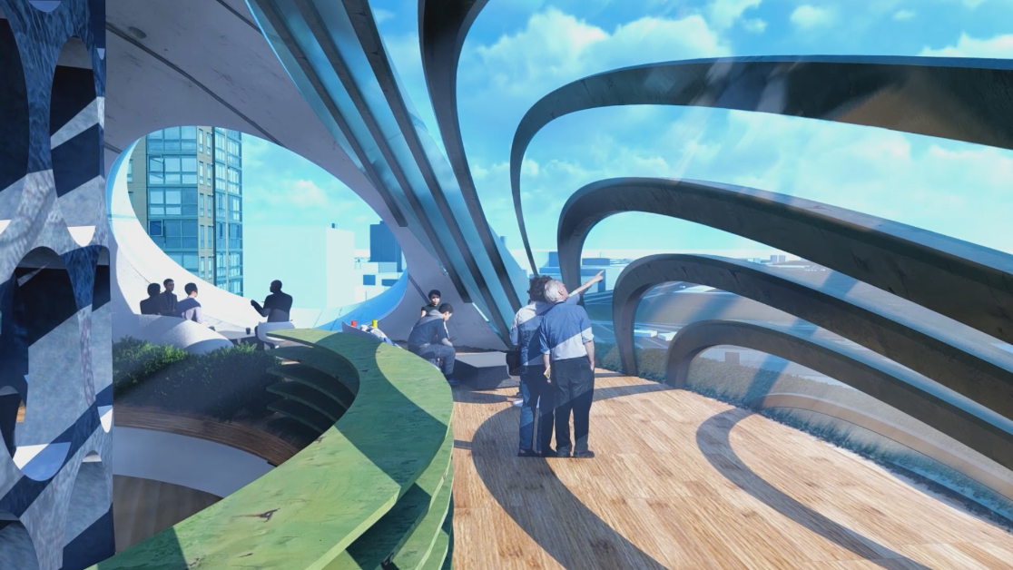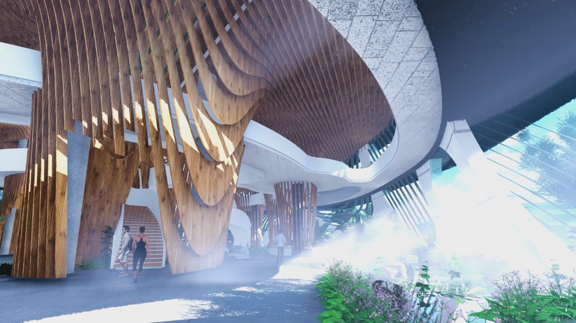 The fifth realm seeks to develop a deep connection and understanding between the user and their body. The spaces here include saunas, baths, an exercise room and two rooms for yoga, stretching, meditation, breathing, and tai-chi courses and practices, which all have cinematic views of the exterior environment. The level right above this allows the user to adventure up to a high place that overlooks the waterfront and the downtown city scape. Here you can find people letting their worries and negativity fly away, a quiet place for tranquility or a place for peaceful conversations.
