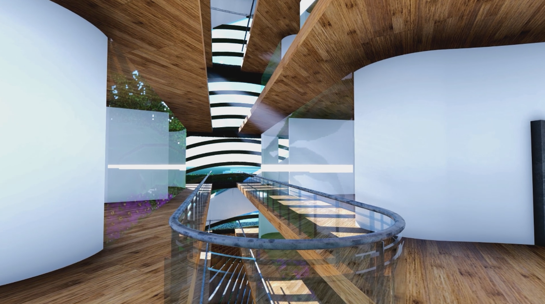 The fourth realm, two levels, is designed to incubate the user by providing healing and sleeping pods, as well as rooms for massage and sauna spa treatments. This realm of the building stimulates and tranquilizes the user into a peaceful meditated mind set, allowing for positive fluidity to flow throughout the body and mind.